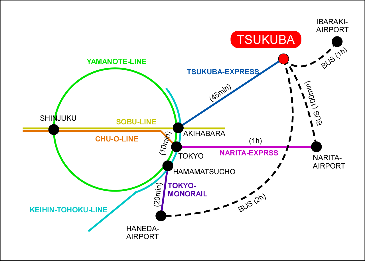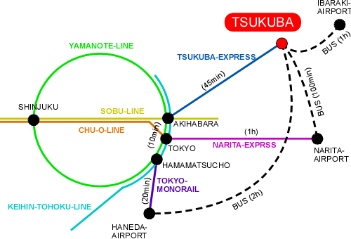 About 120 minutes from Haneda Airport by bus bound for "Tsukuba Center". You should at first buy the ticket at bus ticket counter and take a bus at the bus stop No.6 in the International Terminal or at the bus stop No.13 in the Terminal 1 or 2.