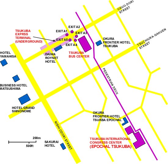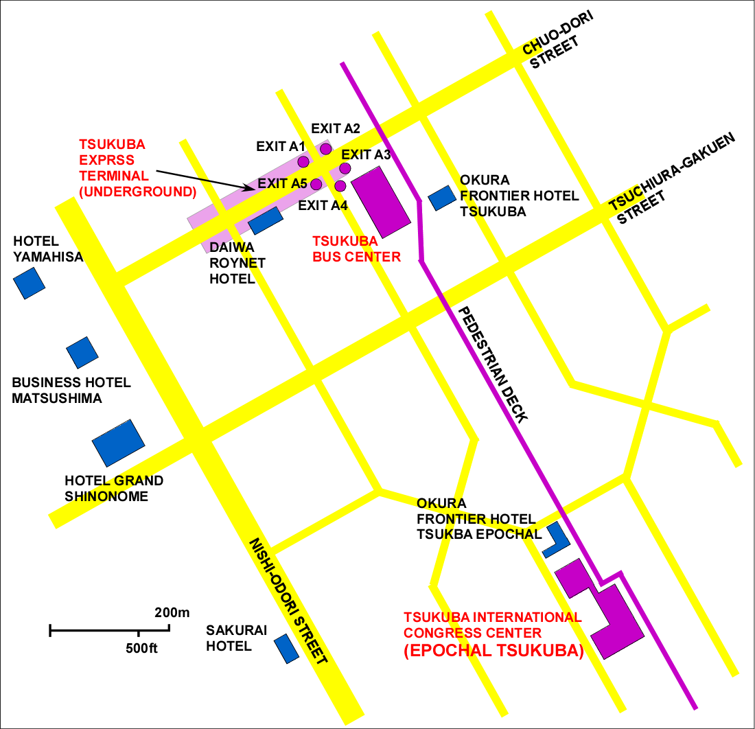The conference venue is about 10 min on foot from Tsukuba Terminal or Tsukuba Center Bus stop via the pedestrian deck.